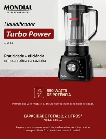 O liquidificador Mondial Turbo Power L-99-FB combina potência de 550W com capacidade total de 2,2L, oferecendo praticidade no preparo de diversas receitas.