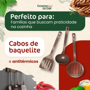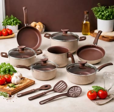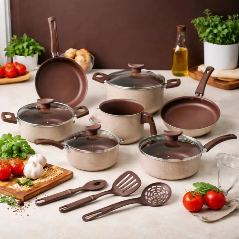O jogo de panelas Essenza Di Cheff Cappuccino com 10 peças é feito em alumínio com revestimento antiaderente, garantindo cozimento uniforme e fácil limpeza.