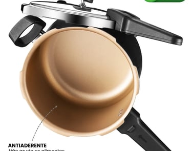 Possui trava de segurança, fácil manuseio e limpeza, sendo ideal para o dia a dia e compatível com diferentes tipos de fogão.
